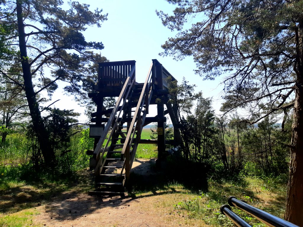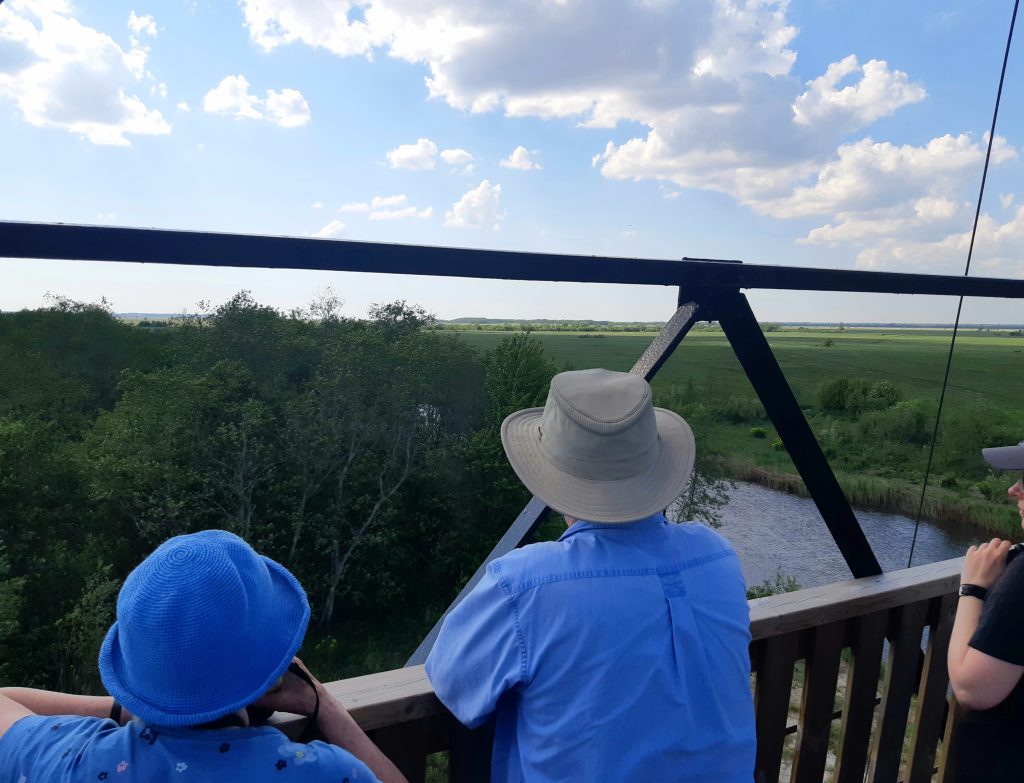 Die Mittagspause verbrachten wir auf einem Beobachtungsturm an einem verschilftem Waldsee. Schilfrohrsänger, Gartenrotschwanz und Beutelmeise waren zu hören. Zwei Wespenbussarde kreisten über dem Wald.