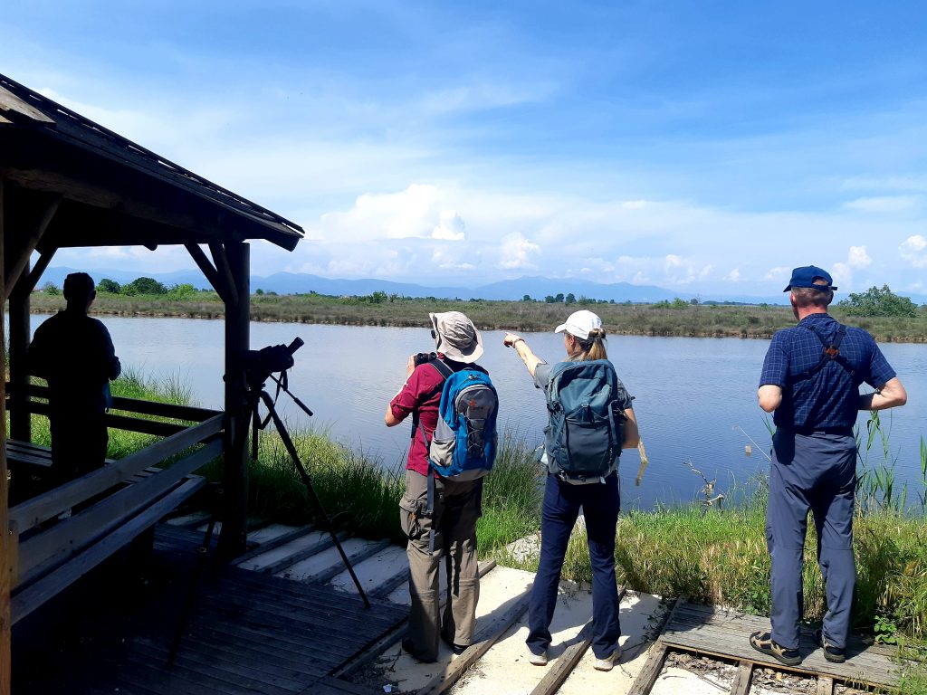 Am Nachmittag haben wir eine erste kurze Exkursion in die nähere Umgebung gemacht. Viele Pirole und Wiedehopfe, Blut- und Kleinspecht, Löffler, Nachtigallen, Gelb- und Blaßspötter, eine schwimmende Schlange und eine prächtige Smaragteidechse.