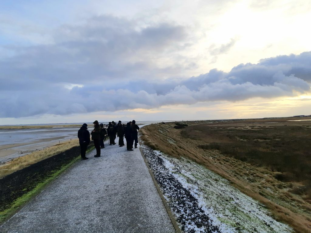 Unsere heutige Exkursion um die Hörnumer Odde wurde stark verkürzt. Die herannahende Schneefront machte die Aufofahrer nervös. Auf der See waren recht viele Eiderenten. Mittel- und Gänsesäger und eine Eisente wurden entdeckt. Auch im Wald waren einige Vögel.